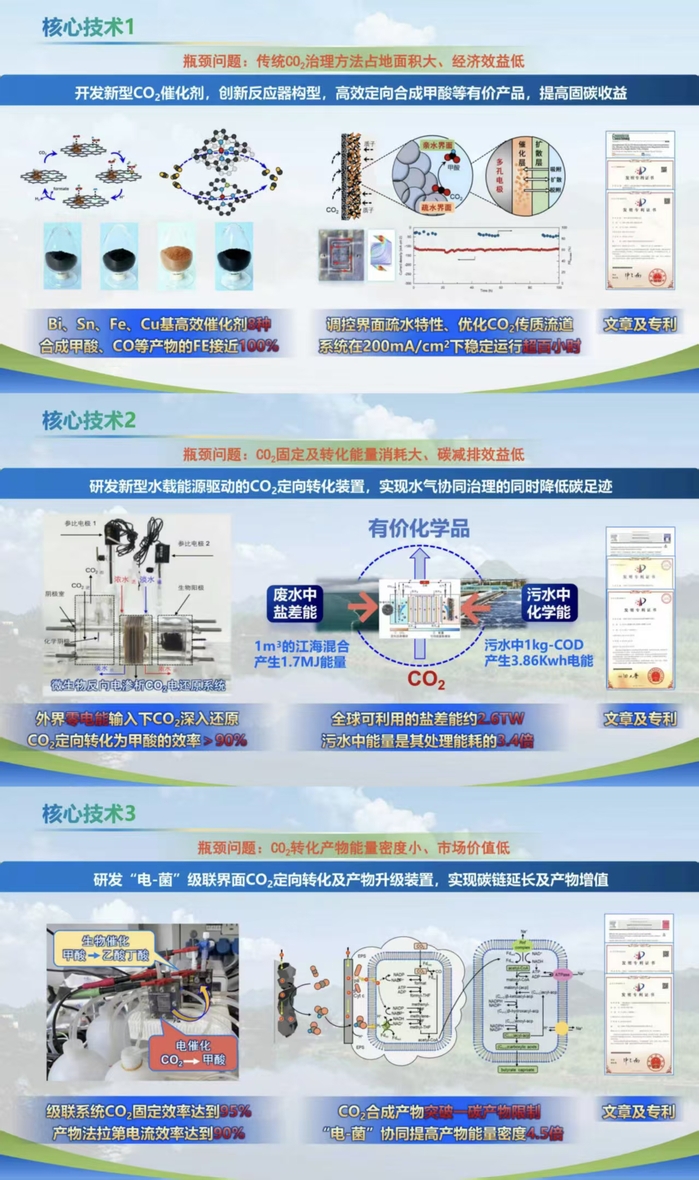 项目介绍:全球范围内CO2排放总量居高不下,CO2作为一种潜在的碳质资源,常以废弃物形式流失。我国已将“碳达峰、碳中和”目标上升至国家战略层面,实现这一宏伟目标的核心在于丰富CO2减排技术路径。针对现有减排技术适配性差、投入成本高、运行效益低、缺乏市场机制等的瓶颈问题,团队创新性地提出通过新型CO2催化剂研发、基于水载能源驱动CO2定向转化装置构建、“电-菌”级联界面CO2定向转化及产物升级装置的开发,实现水气协同治理及CO2的高效增值转化。项目成果已发表行业顶级期刊24篇,累计影响因子228.5;授权发明专利7项,申请国家发明专利3项。该项目的研发为全球生态治理与可持续发展贡献中国智慧与方案。