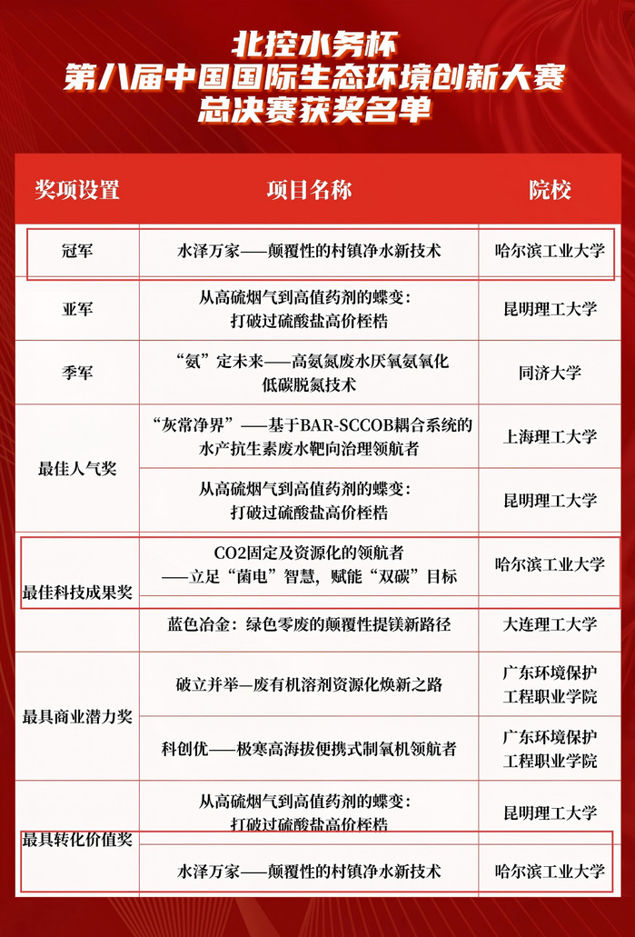 2025年11月22日,北控水务杯第八届中国国际生态环境创新总决赛在云南昆明圆满收官。成人在线 获得创新引领组织奖,成人在线 “水泽万家——颠覆性的村镇净水新技术”项目荣获冠军、最具转化价值奖,“CO2固定及资源化的领航者——立足‘菌电’智慧,赋能‘双碳’目标”项目斩获最佳科技成果奖。唐小斌、孙志强老师获优秀指导教师奖。