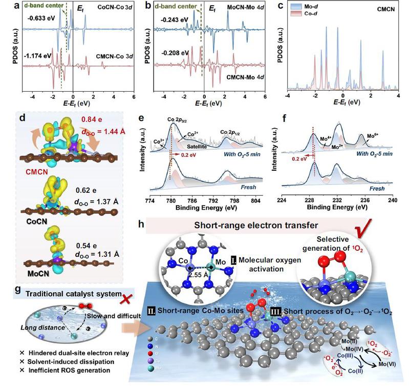 针对此科学技术难题,王威教授课题组提出了一种无需外加氧化剂和额外能量输入的分子氧活化新策略。团队通过构建原子级相邻的双金属位点,利用d-d轨道耦合与电子离域效应,在催化剂内部形成短程、高效的电子传输通道,从而强化O2吸附并通过π*轨道有效削弱O-O键,实现在温和条件下对O2的直接、高选择性的单线态氧转化。该体系在无偏压、仅曝气条件下,其活性氧物种生成速率和污染物降解性能可与传统化学氧化剂体系相媲美,而运行成本降低了约100倍。同时,该催化体系在复杂水体中表现出优异的稳定性和普适性,可应用于污染物降解、无机离子转化及细菌灭活等领域。这项研究为构建可持续、高效的分子氧活化体系提供了新的设计范式,为下一代能量中性催化技术的发展奠定了重要基础。
